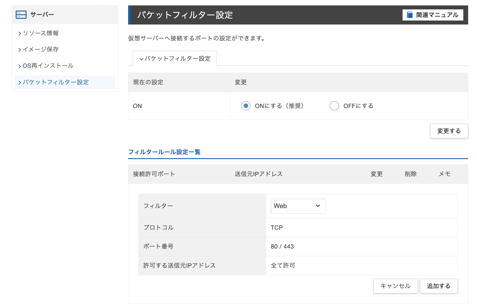 VPSパネルの「パケットフィルタ設定」メニューを開き、Web (TCP 80 / 443) の行を追加して「設定する」ボタンを押します。