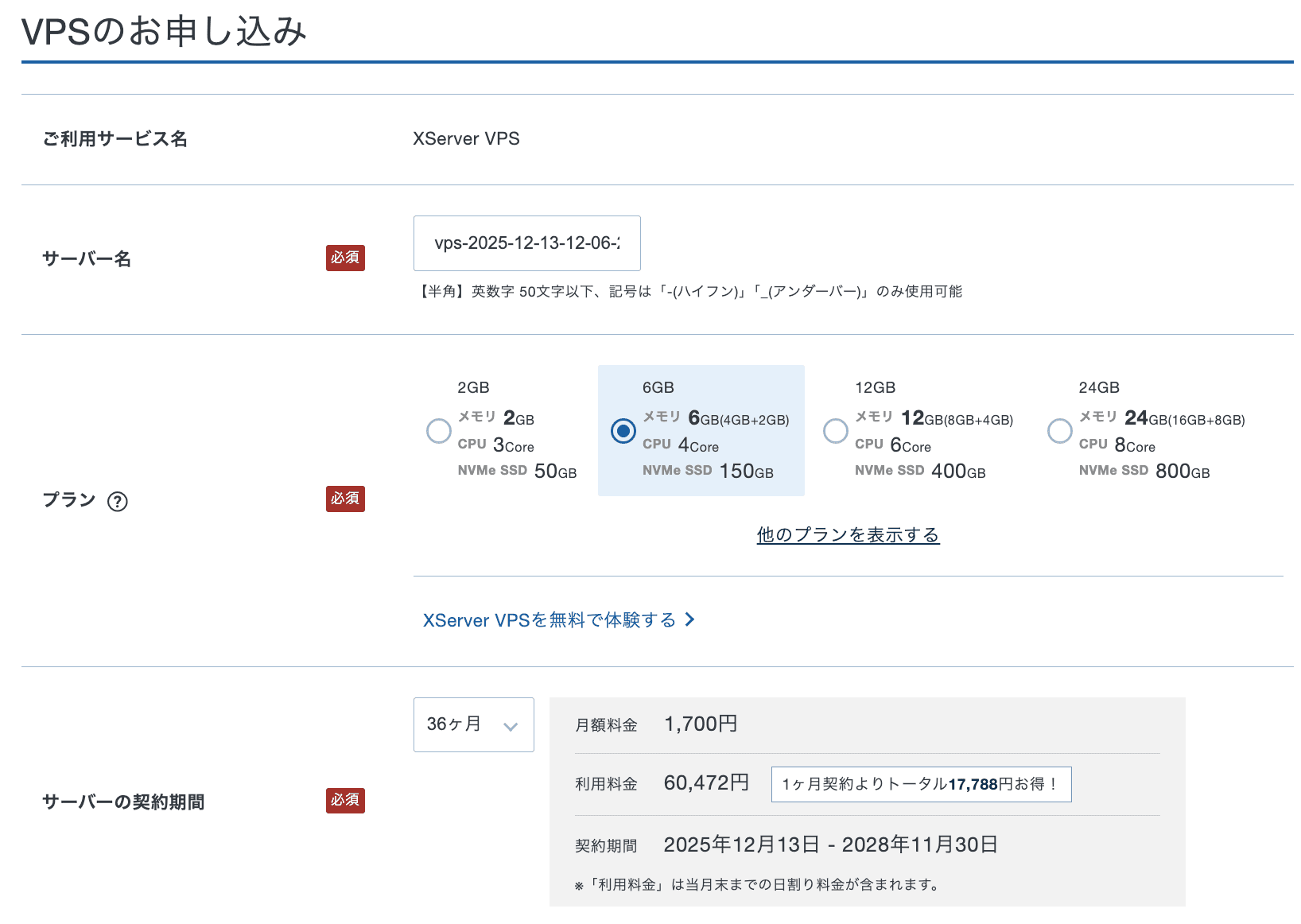 Xserver VPSは現在「6GBプラン」を提供しているため、他社の4GBプランと同じような価格帯でメモリに1.5倍の余裕があります。 これならDifyとn8nを同居させてもサクサク動きます。