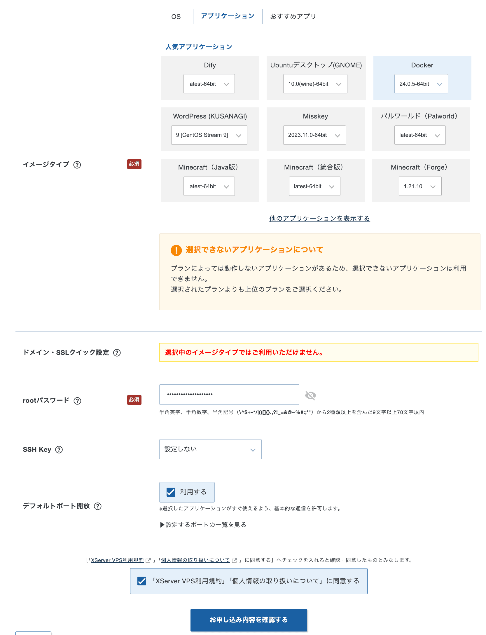 OSは「Ubuntu」、アプリケーションは「Docker」を選択することで、環境構築の手間を大幅に削減できます。