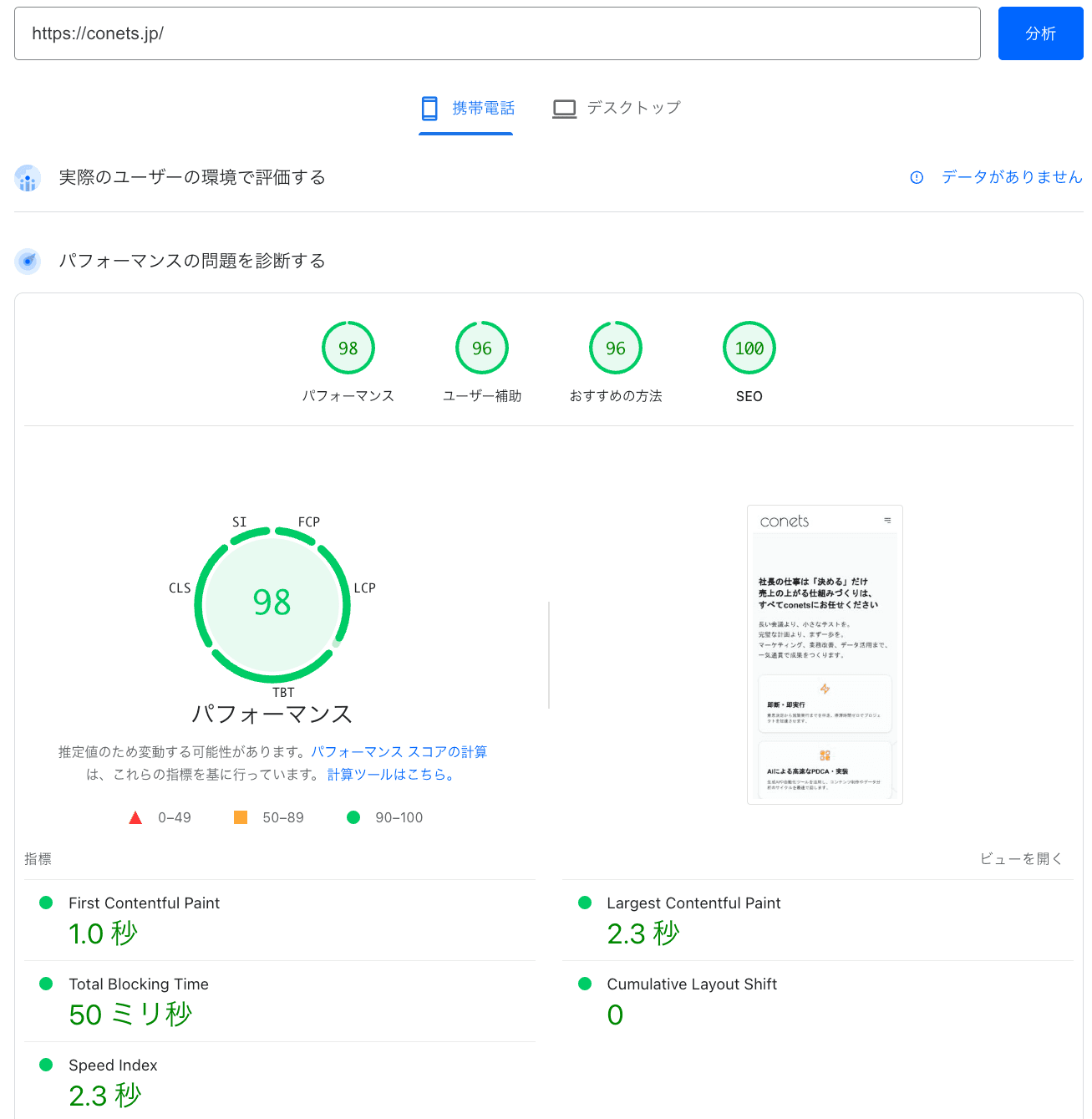 サードパーティスクリプトの影響は避けられませんが、ビジネスゴール(計測・分析)のために「98点で妥協する」という現実的な判断を下しました。