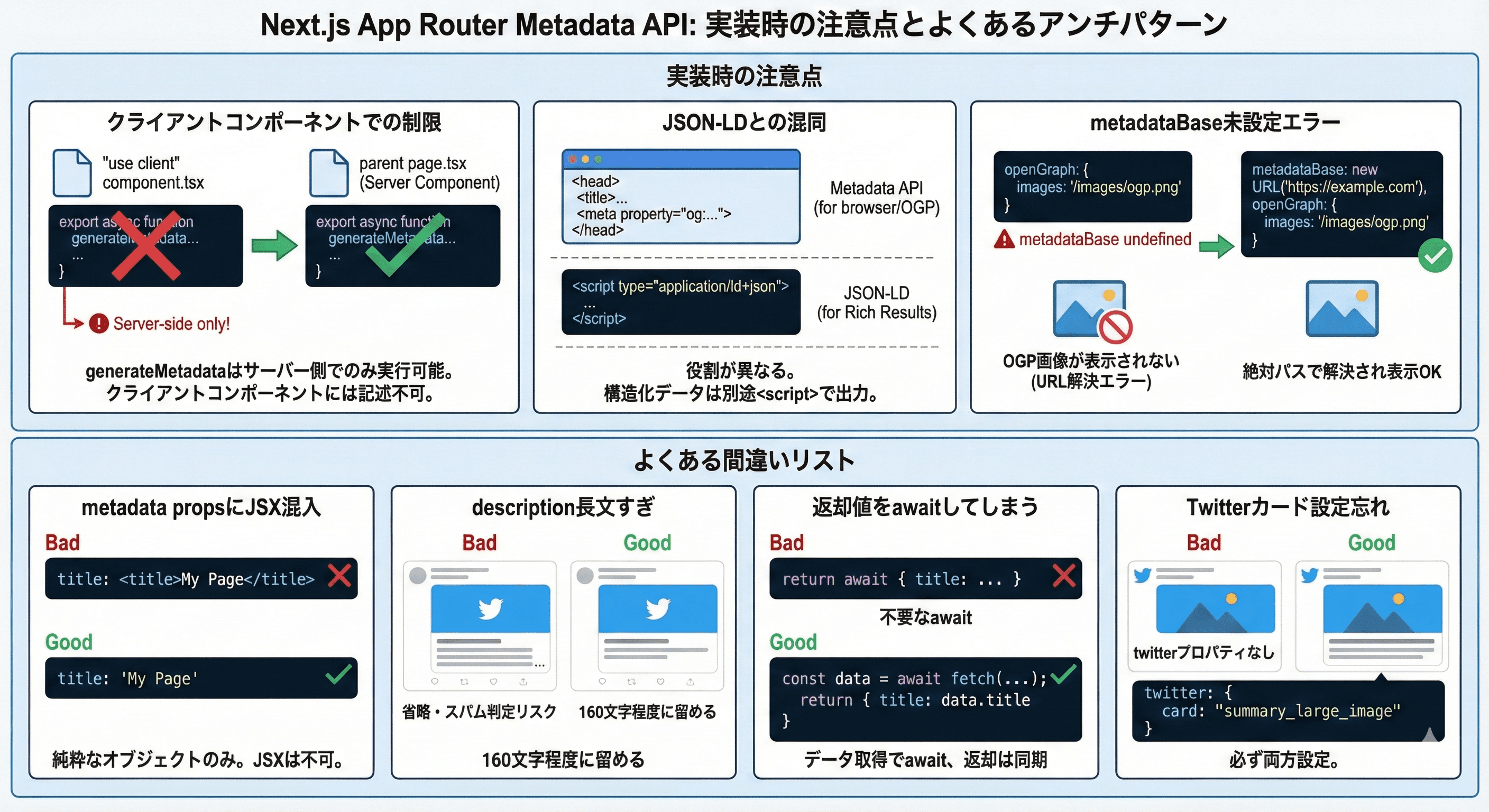 メタデータ実装時の注意点として、generateMetadata はサーバーコンポーネントでのみ動作すること、JSON-LD(構造化データ)とは別物であること、スマホ検索結果を意識したタイトル文字数などが挙げられます。